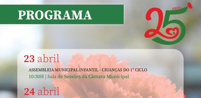 Às 10h30 realiza-se a Sessão Solene Comemorativa do 25 de Abril no CineTeatro Municipal. O programa inclui ainda um almoço de confraternização, às 13h00, no Parque de Merendas Municipal, mediante inscrição prévia até 17 de abril.