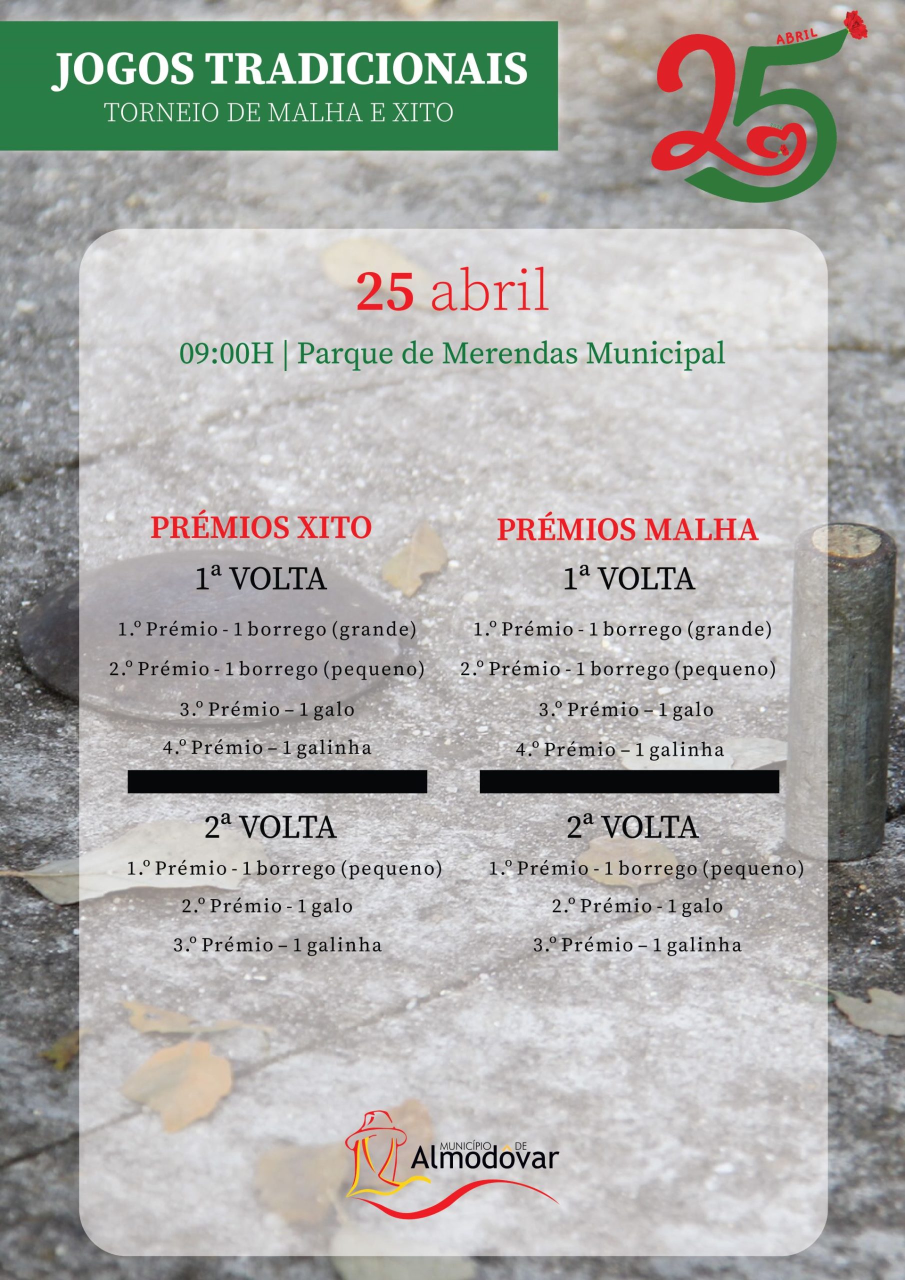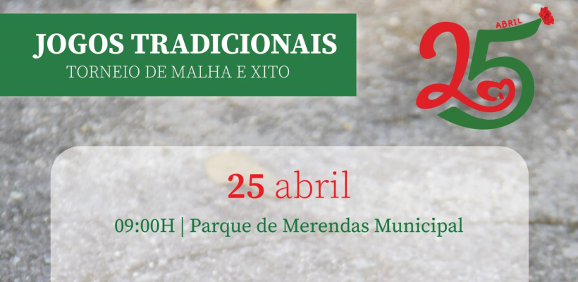 Durante a manhã do Dia 25 de Abril, às 09h00, realizam-se Jogos Tradicionais, nomeadamente Malha e Xito, no Parque de Merendas Municipal.