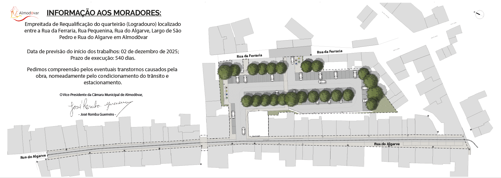 A Câmara Municipal de Almodôvar informa que teve início no dia 2 de dezembro de 2025, a Empreitada de Requalificação do Quarteirão (Logradouro) localizado entre a Rua da Ferraria, Rua Pequenina, Rua do Algarve, Largo de São Pedro e Rua do Algarve, em Almodôvar.