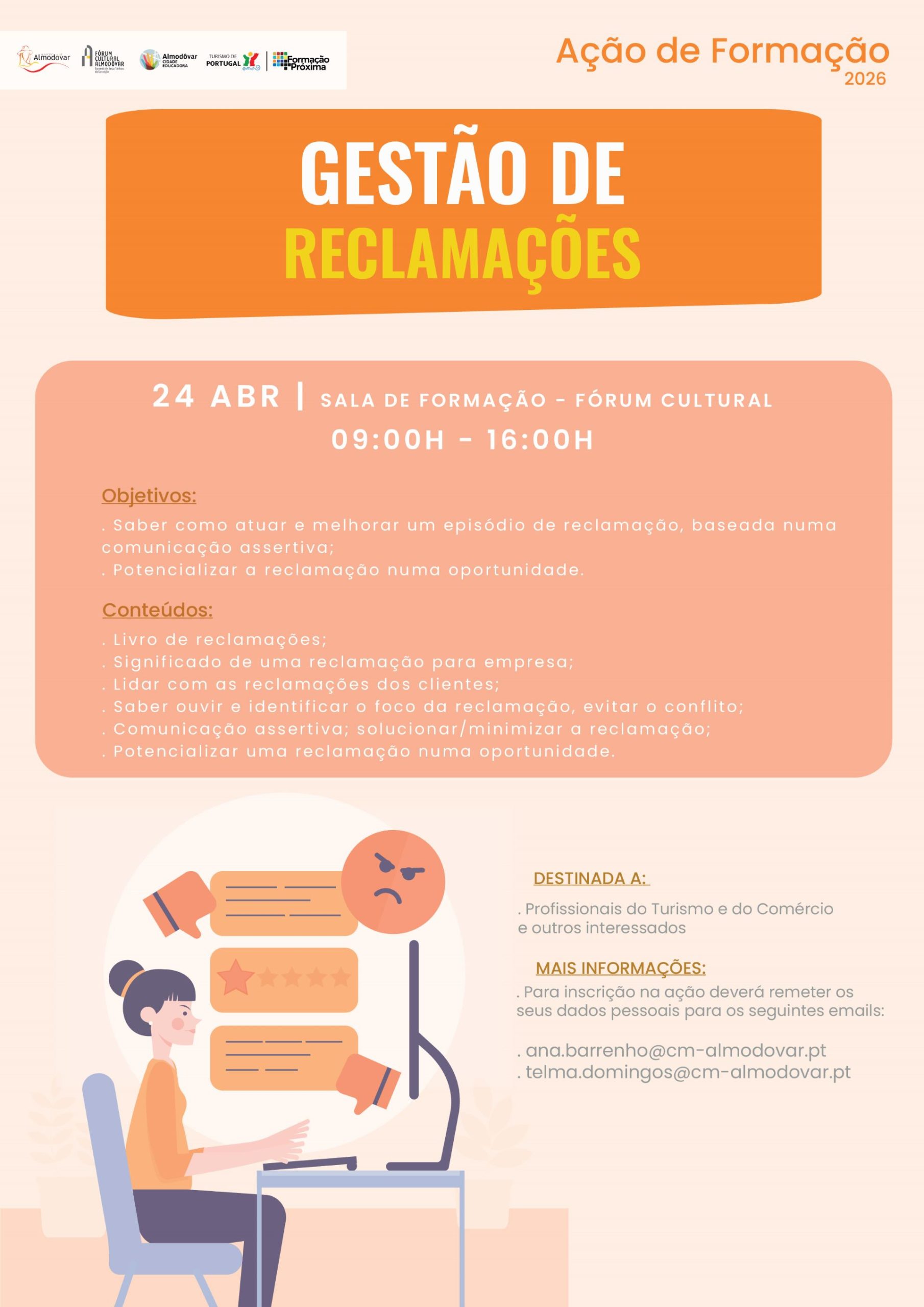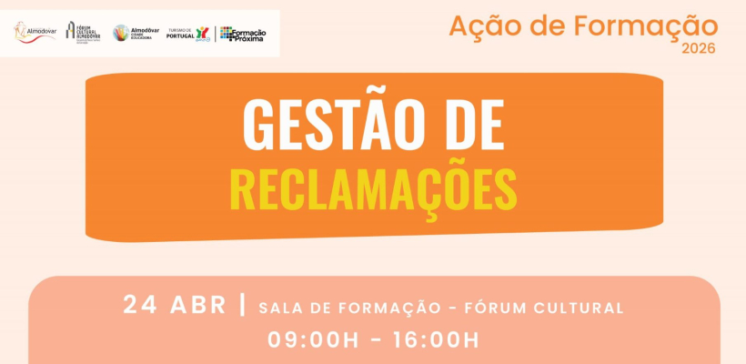O Município de Almodôvar promove, no próximo dia 24 de abril de 2026, uma ação de formação dedicada ao tema “Gestão de Reclamações”, a decorrer na Sala de Formação do Fórum Cultural, entre as 09h00 e as 16h00.