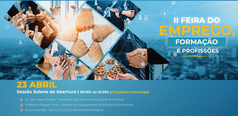 O Município de Almodôvar promove, nos dias 23 e 24 de abril, no Cineteatro Municipal, a II Feira do Emprego, Formação e Profissões.